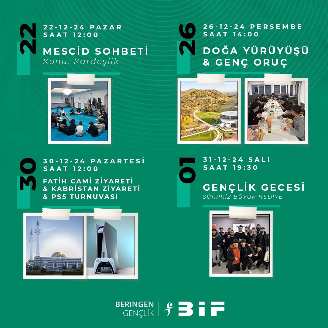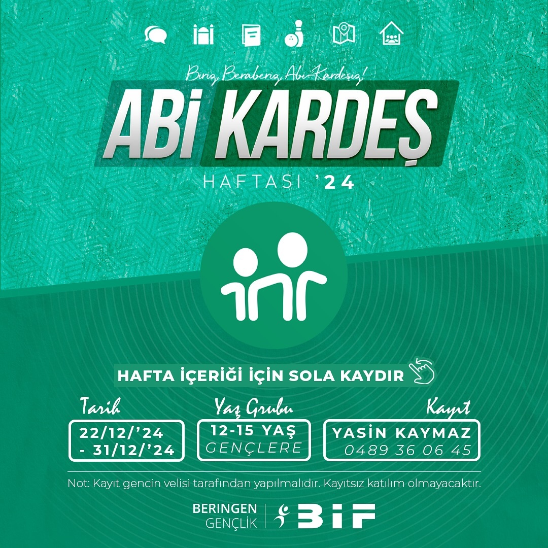 12-15 yaş arası gençlere özel bu anlamlı etkinlikte sizleri aramızda görmek istiyoruz! BİF Beringen Gençlik tarafından organize edilen Abi-Kardeş Haftası, 22 - 31 Aralık 2024 tarihleri arasında gerçekleşecektir.